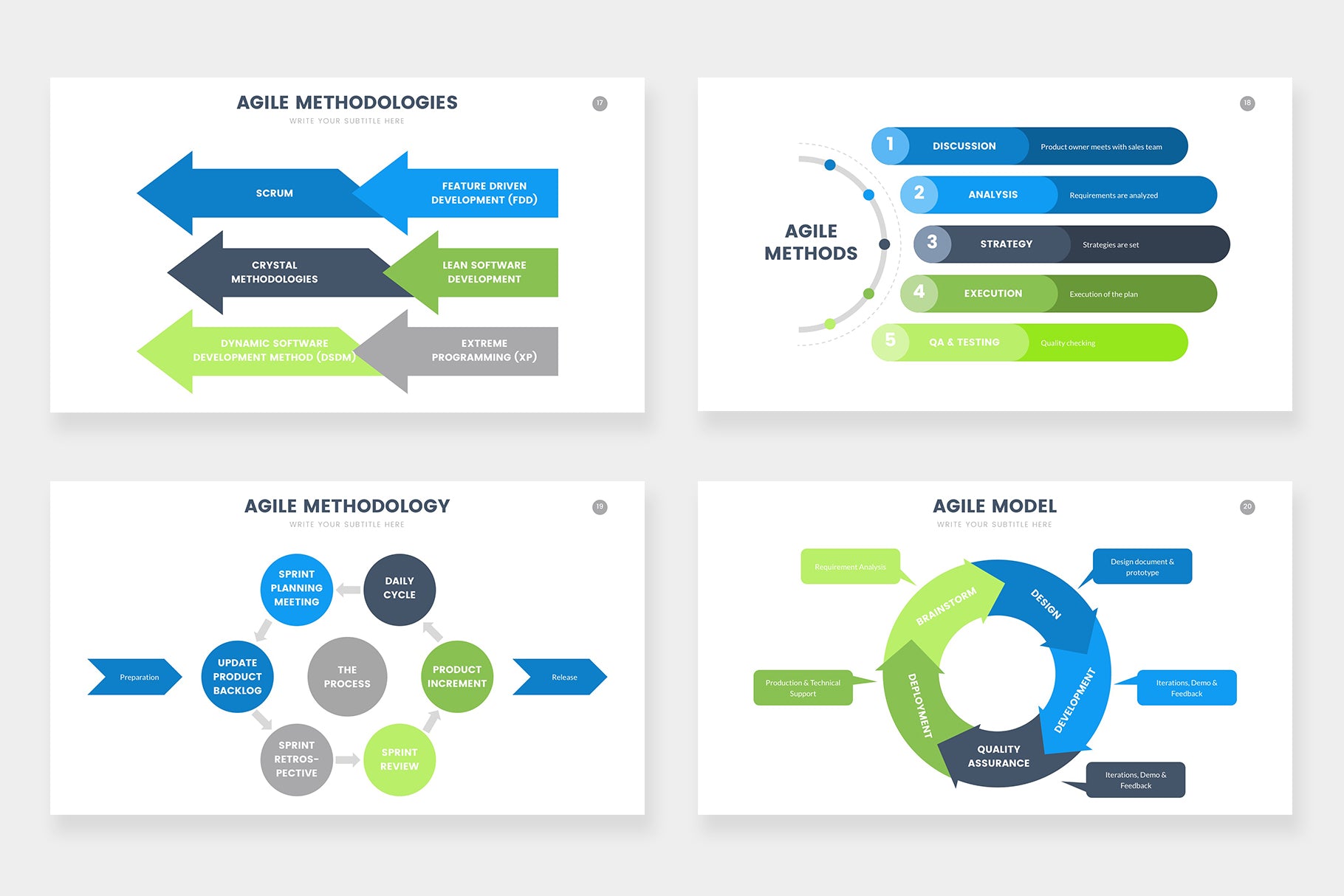 These Agile Infographics are a great way of breaking down a project for your team members and clarifying expectations for your customers. Not only do you have a variety of slides to choose from but they're easily edited and customized.