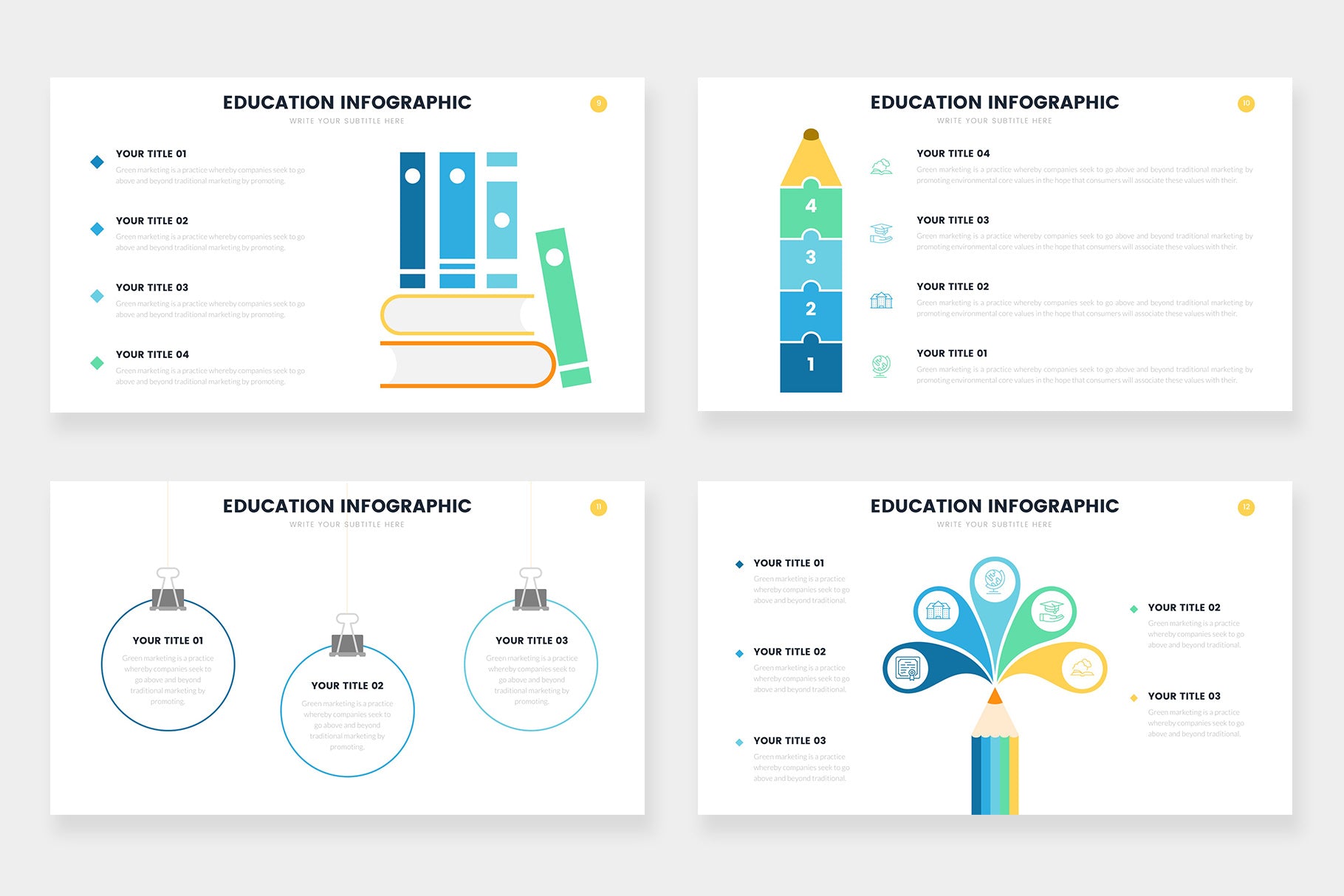Our education infographics can also be used for representing different reading topics, writing projects, graduation roadmaps and different documentation needed for classes. Another great topic you can cover is awards you offer in your class for your students.Â