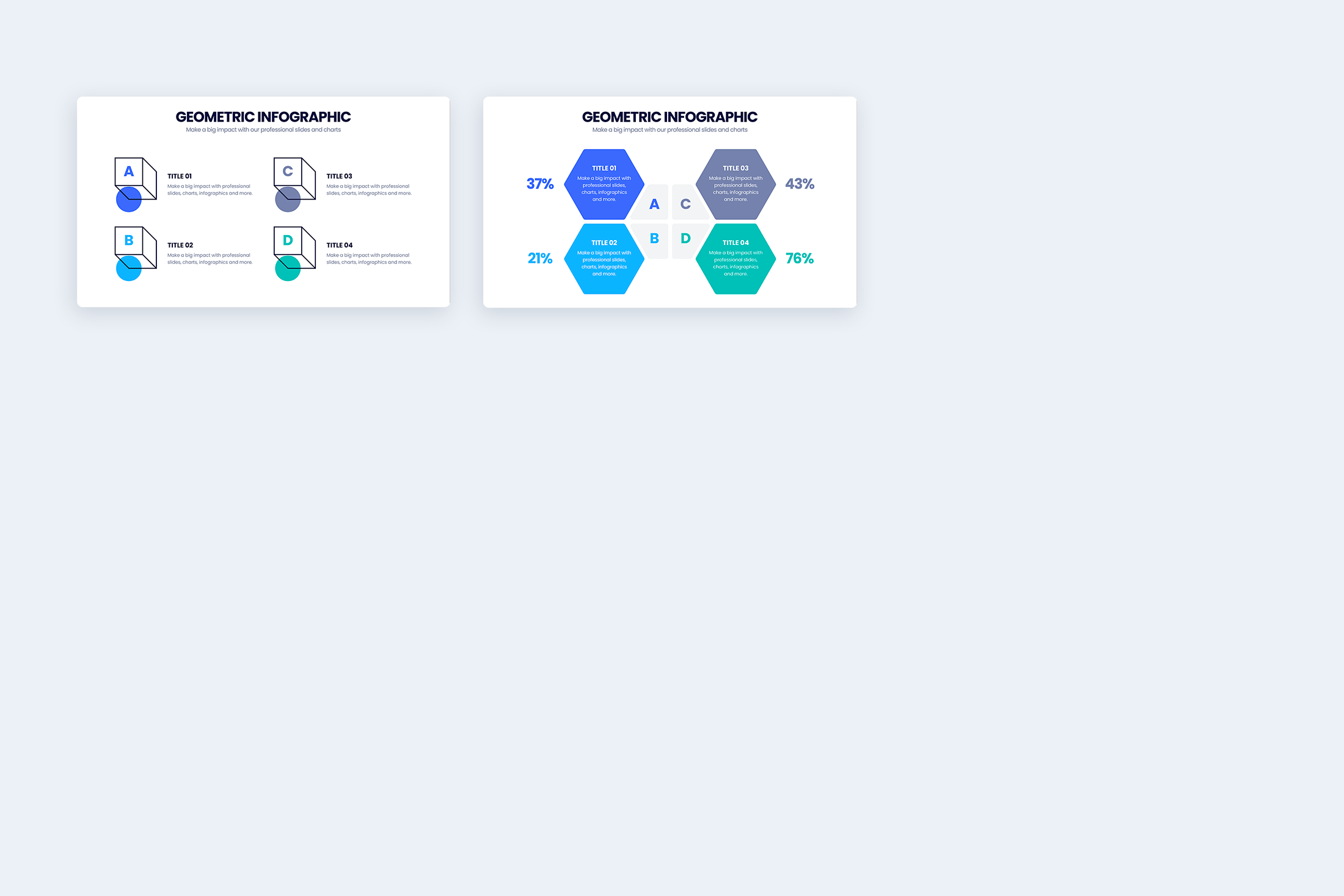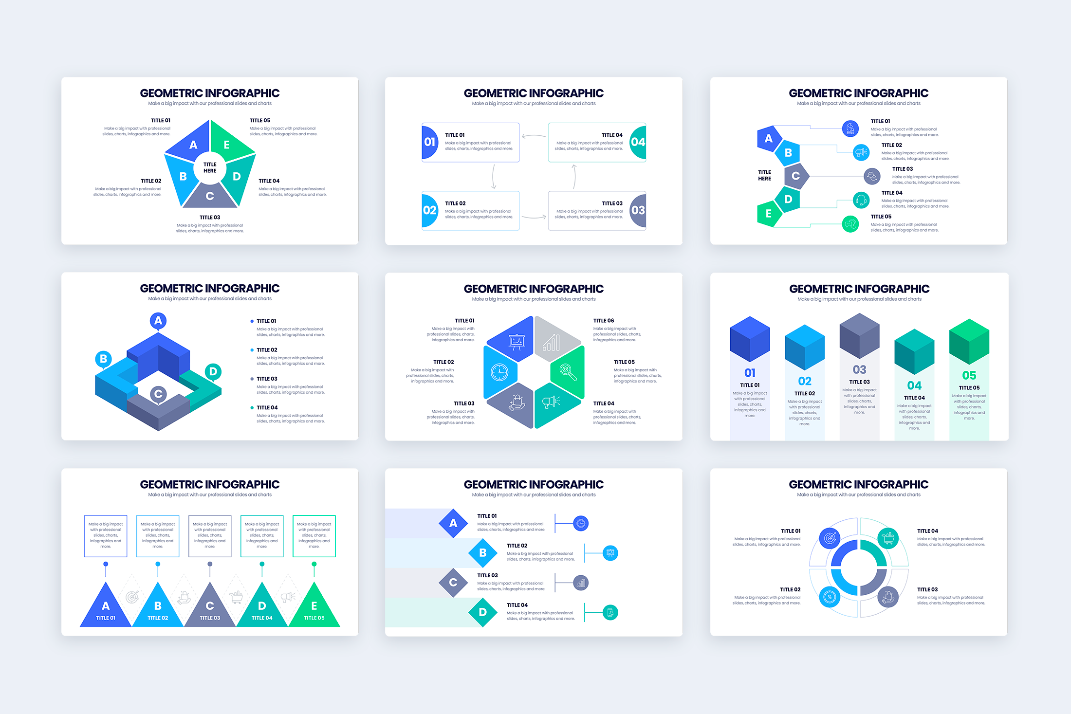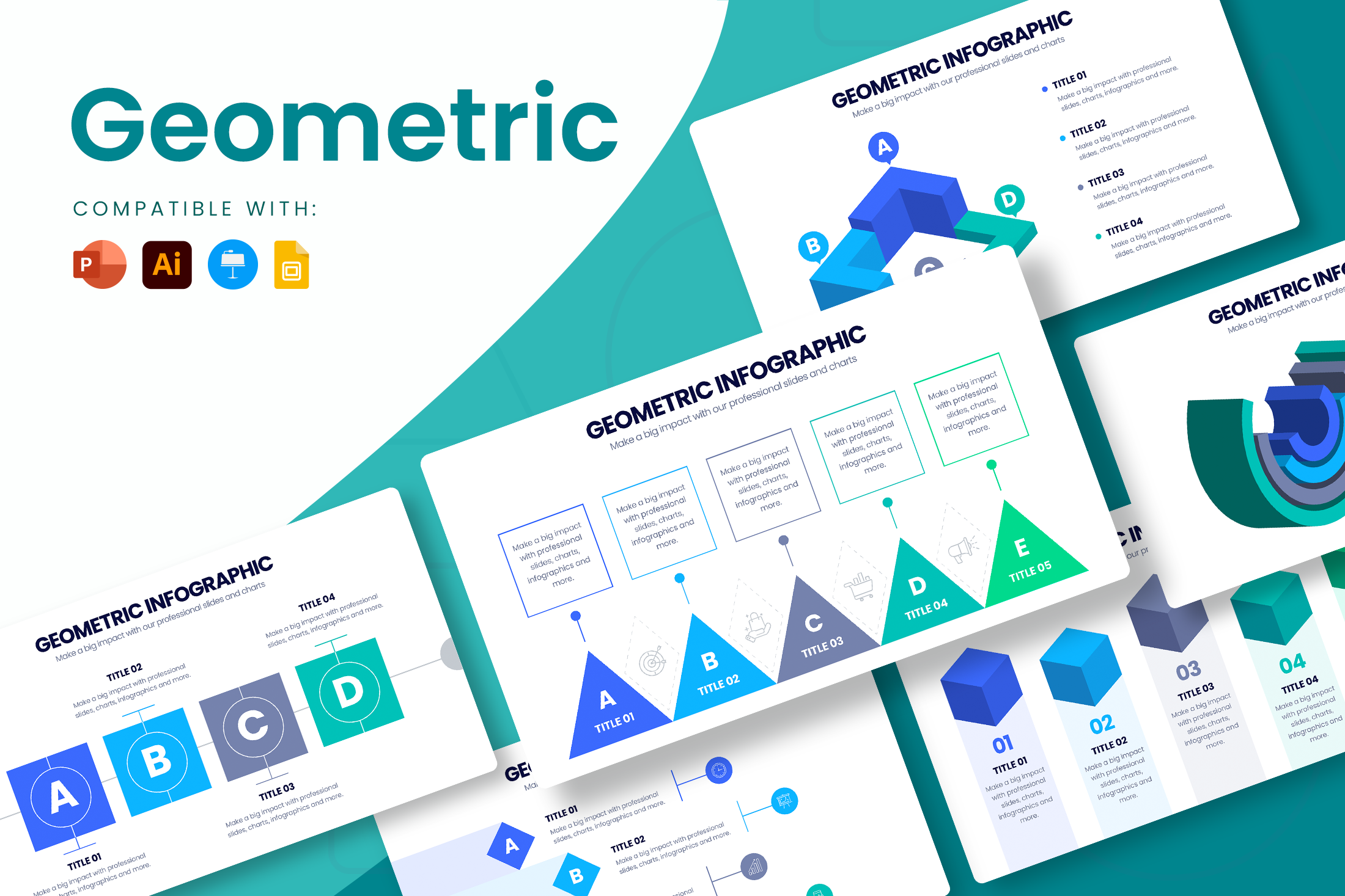 Our Geometric infographics collection is designed for everyone to use. Wether you're a teacher, consultant or student. Our Geometric slides are designed to show case timelines, steps, key elements, and so much more with geometric shapes. Make your presentation stand out and impress your audience with our Geometric slides.Â