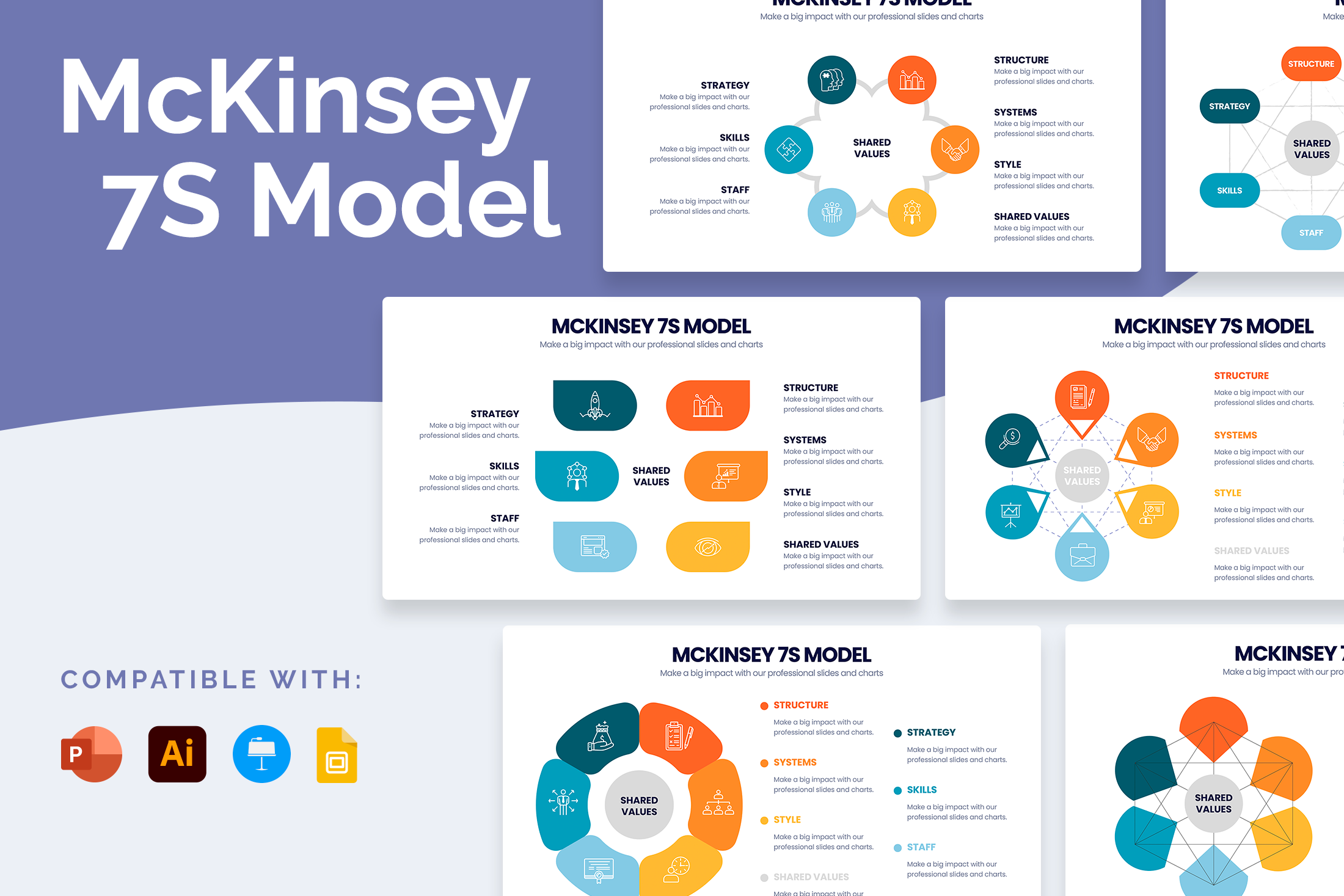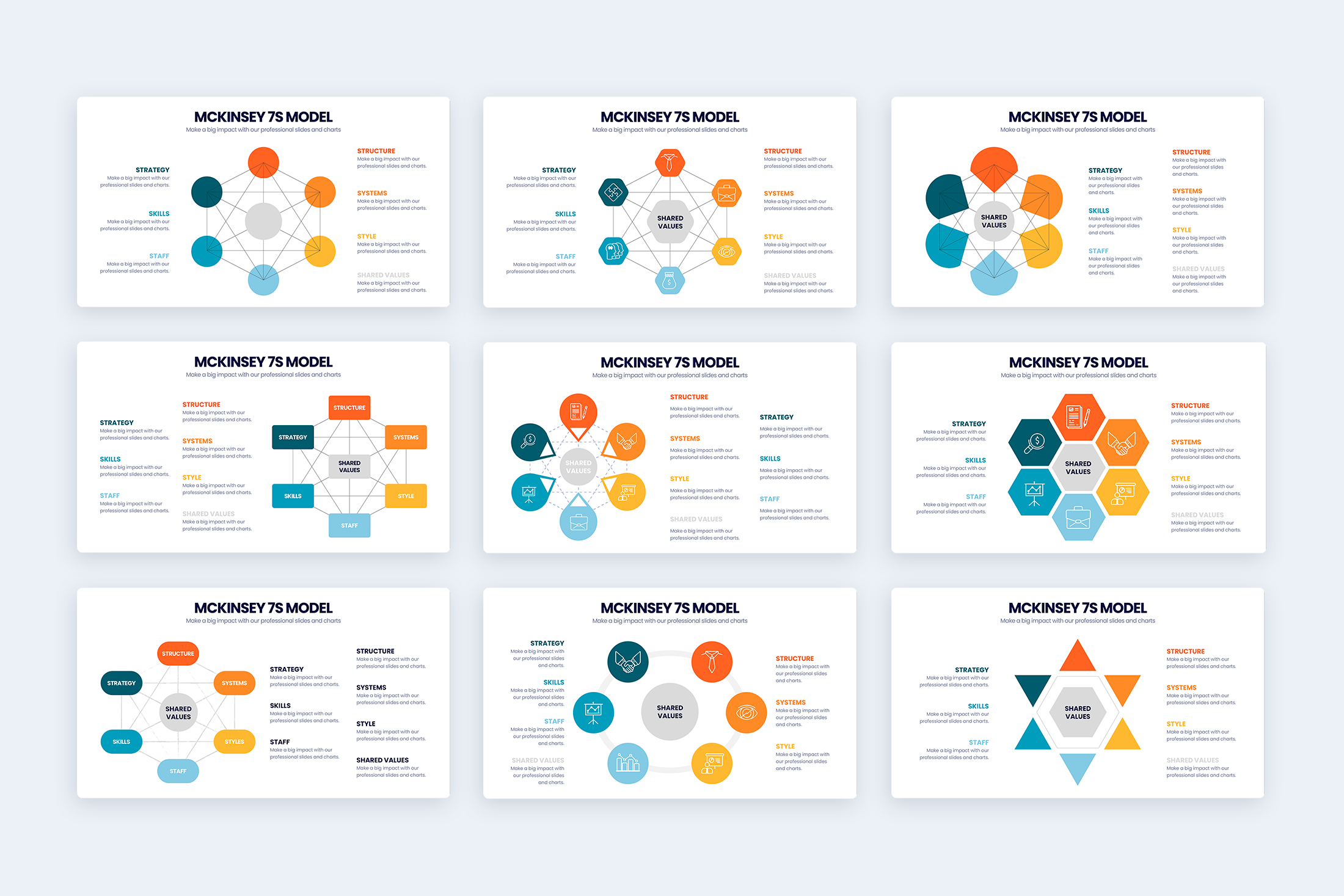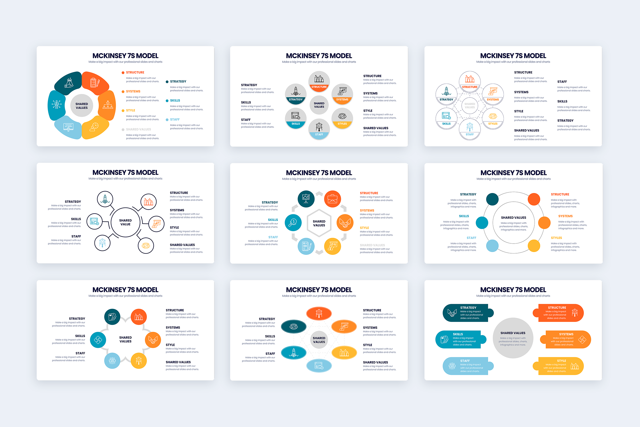This model can be used to help you improve the performance in your organization, or determine the best way to implement a strategy in your organization. You can also use the McKinsey 7S Model to create a presentation on the likely effects of future changes in your organization.