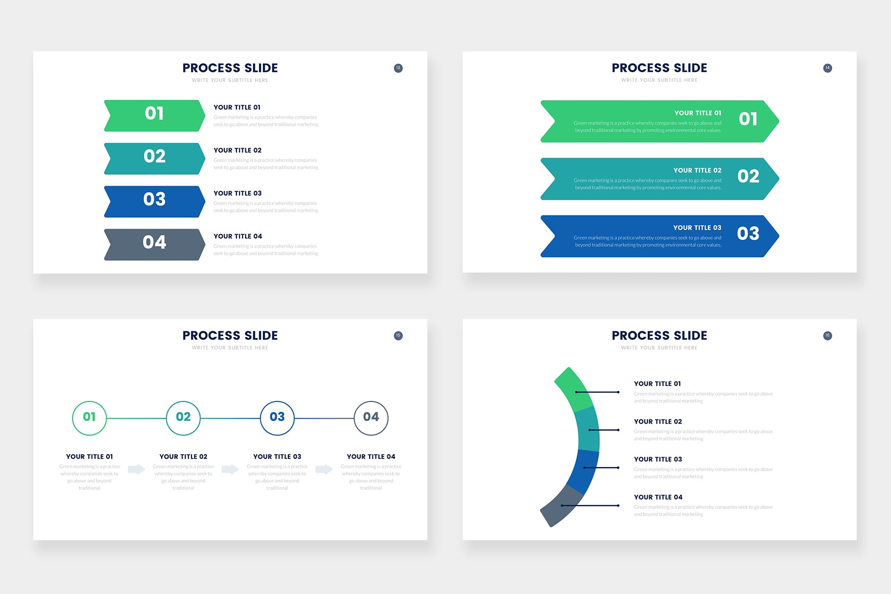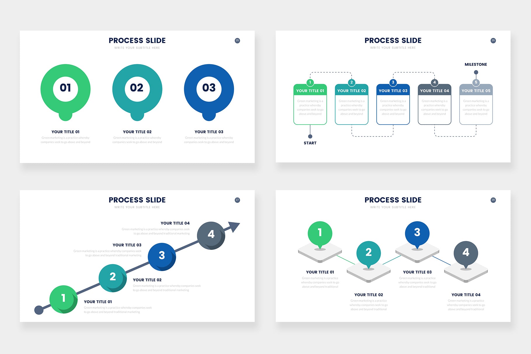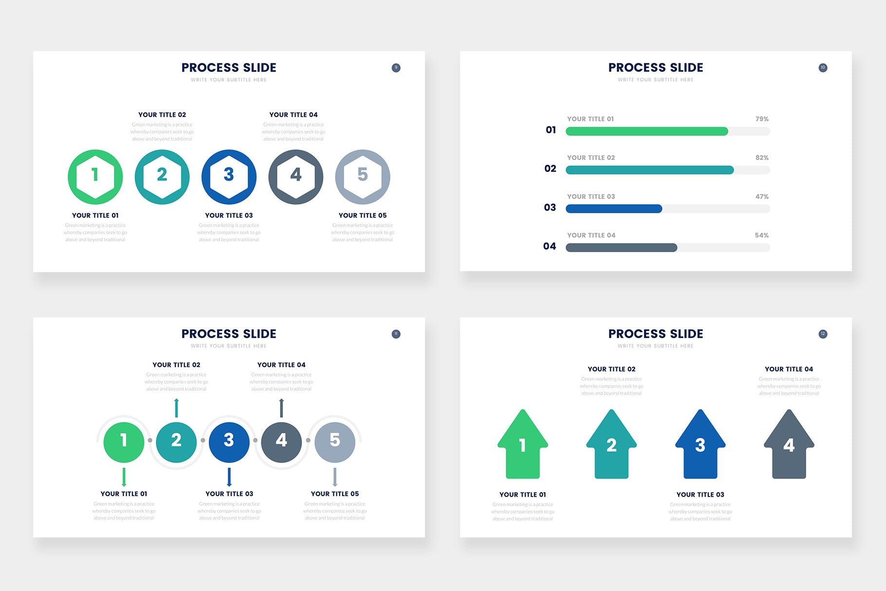 Process infographics compatible with Powerpoint, Keynote and Google Slides.