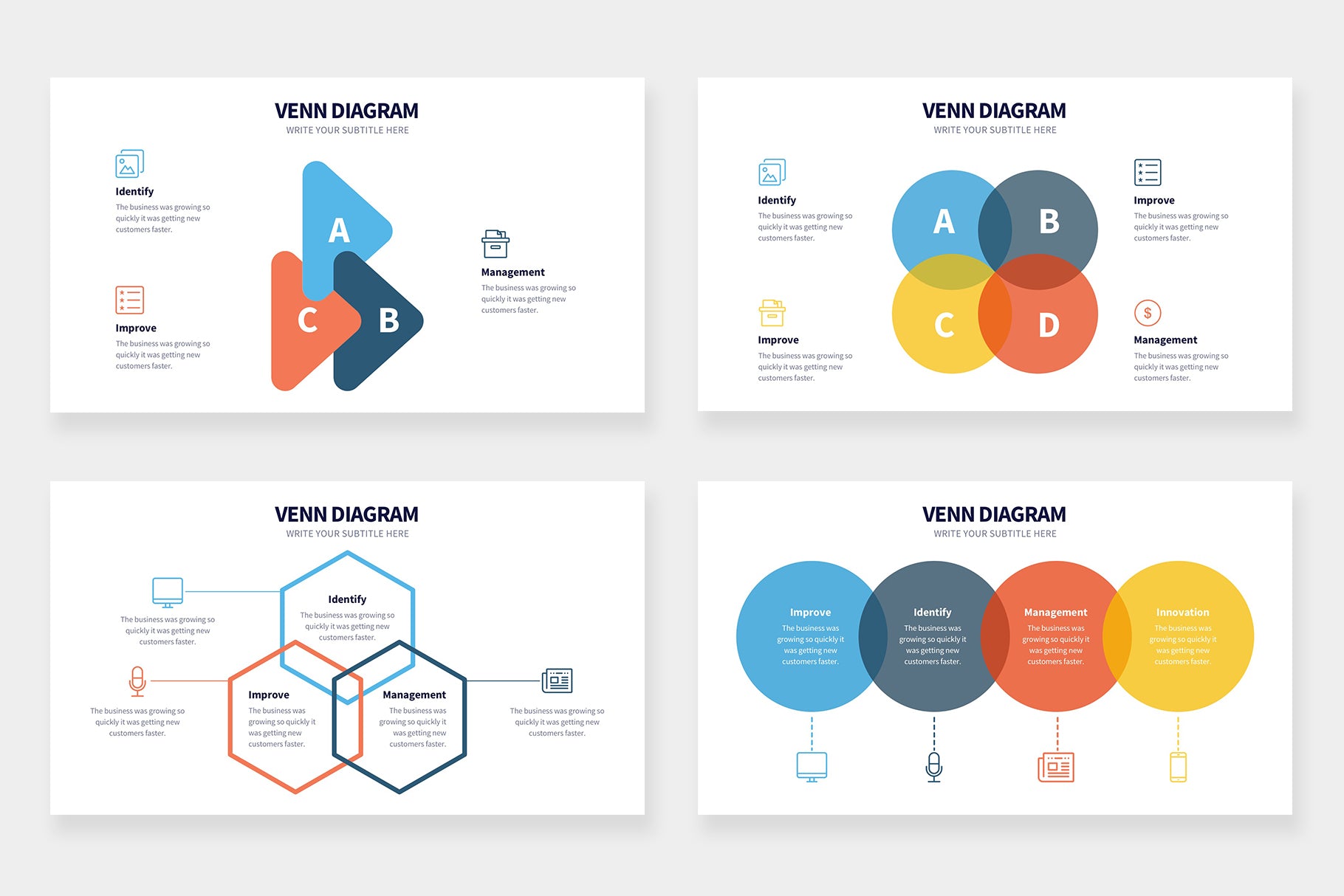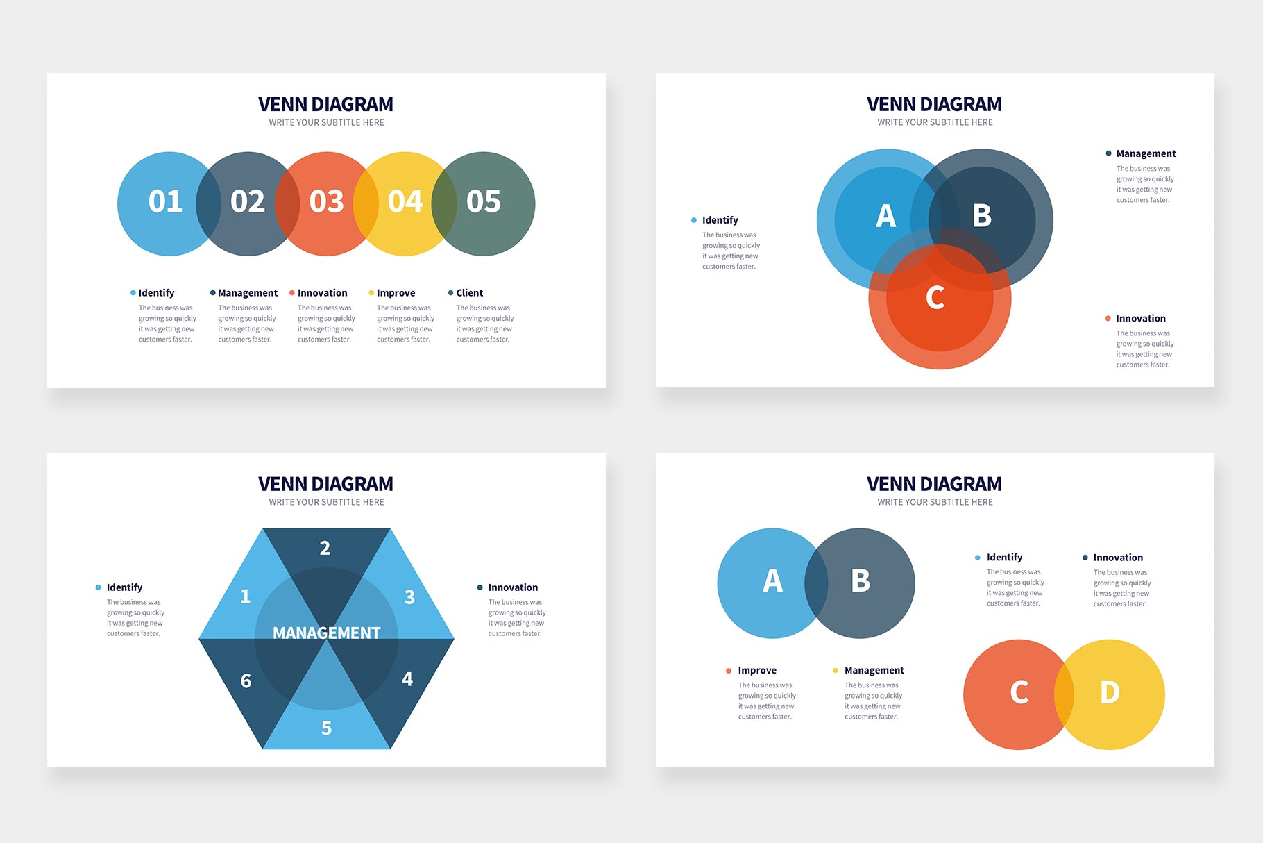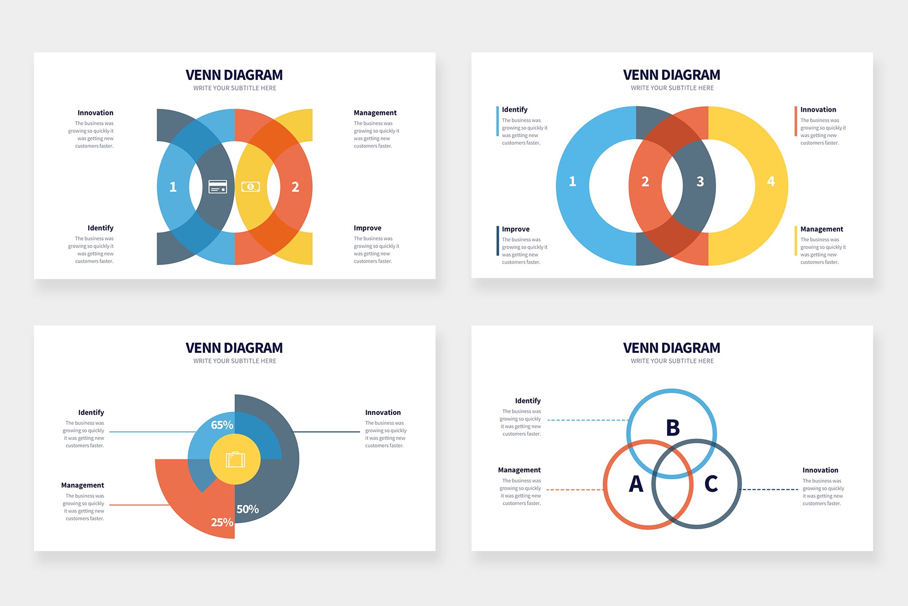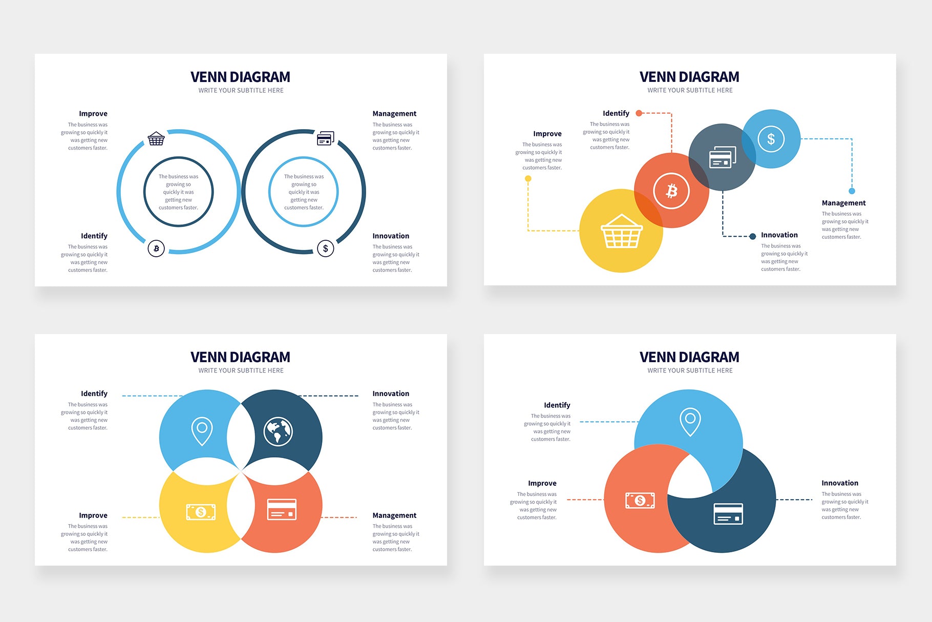 Use these Venn diagrams for any project presentation. Easy to edit.