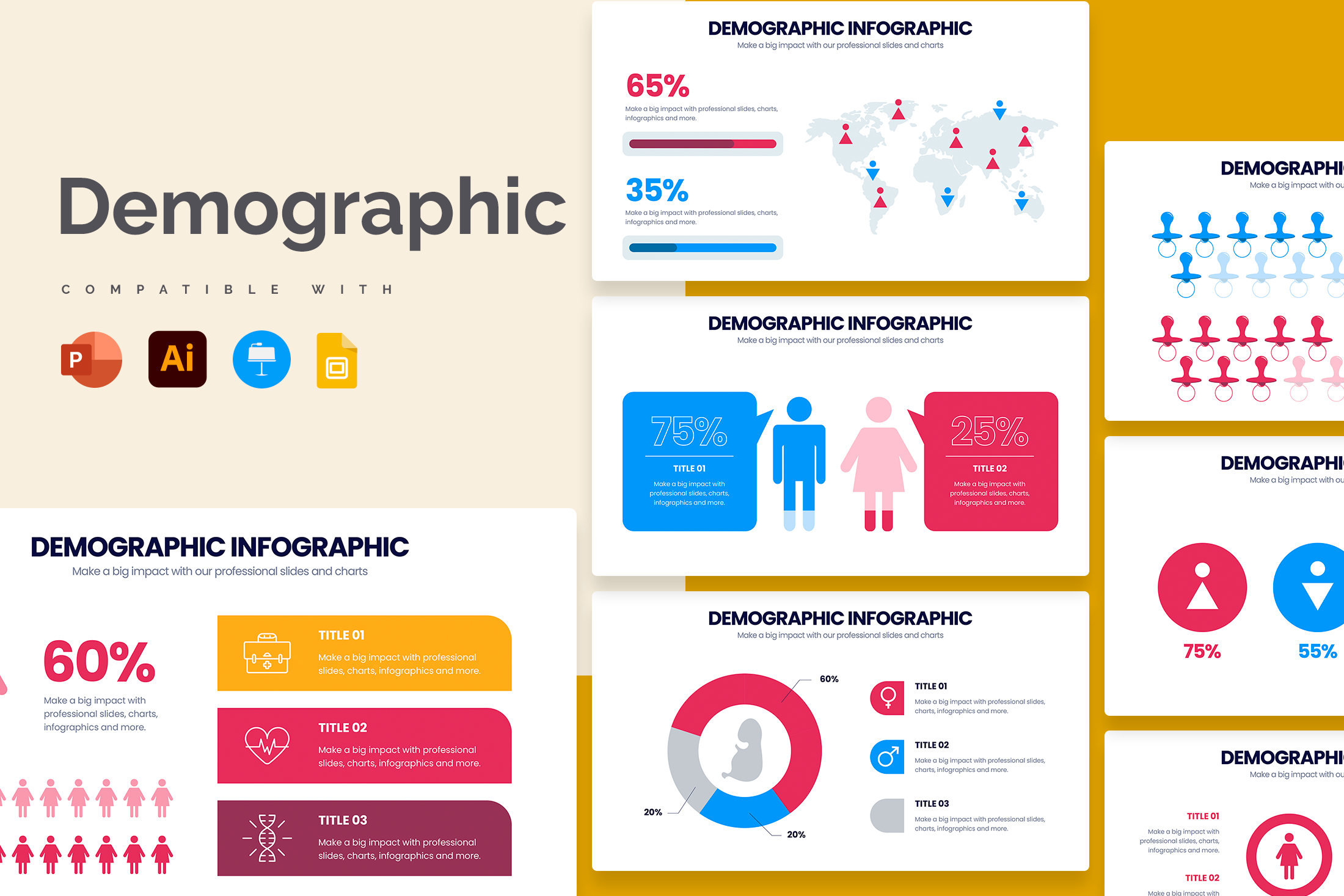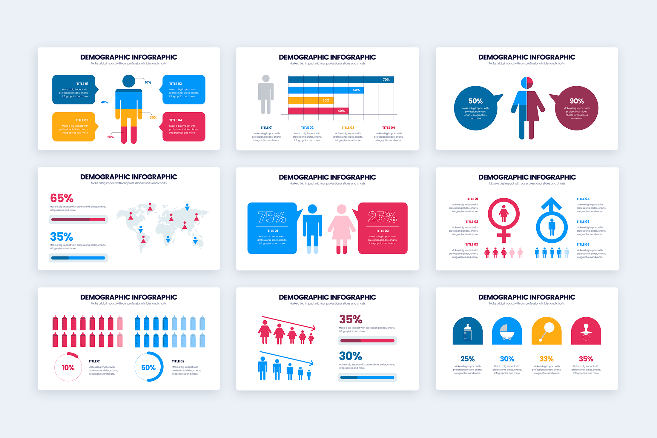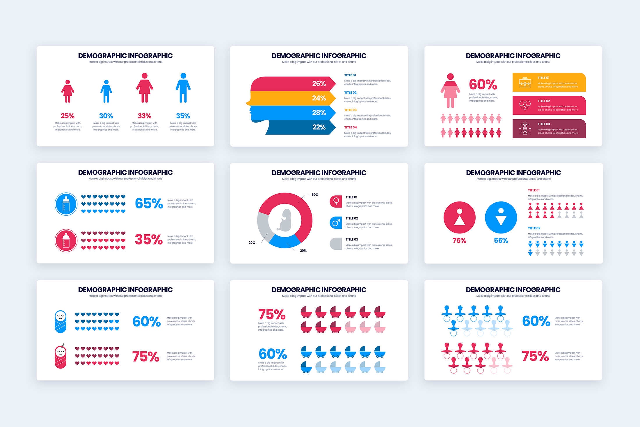 Segmenting a population by using demographics allows companies to determine the size of a potential market. The use of demographics helps to determine whether its products and services are being targeted to that company's most important consumers. Our demographic infographics are a perfect way to represent your findings in a visual way.
