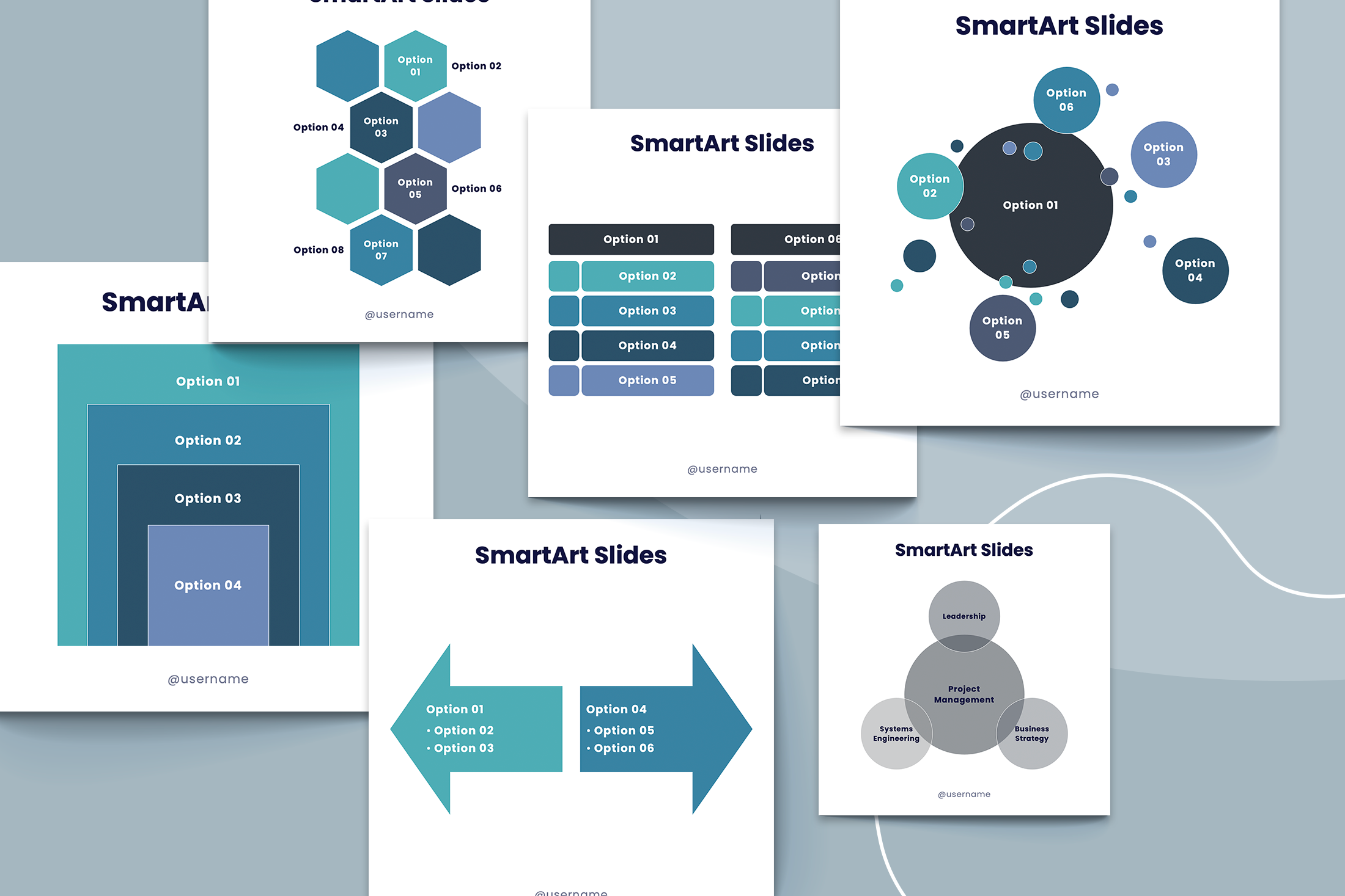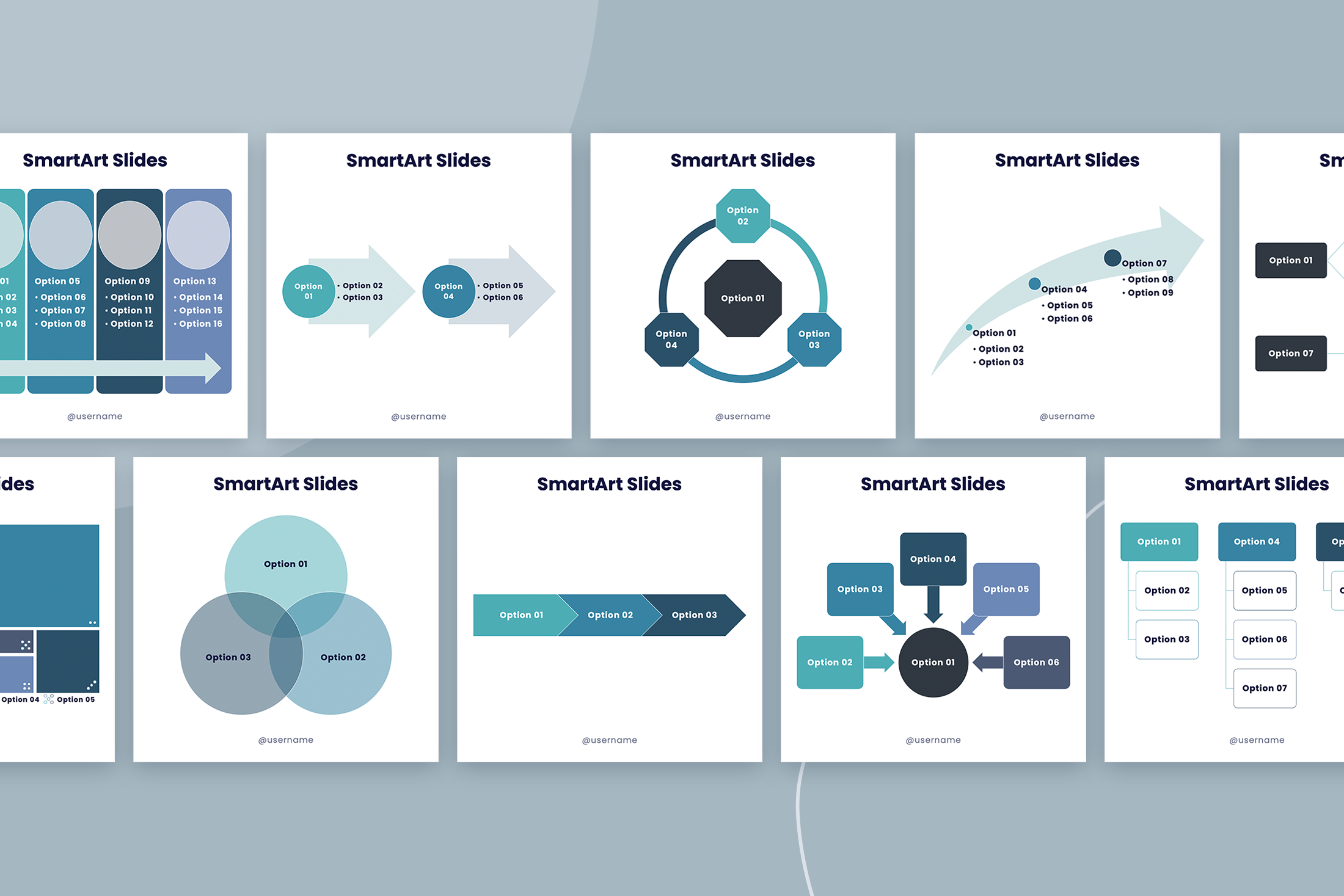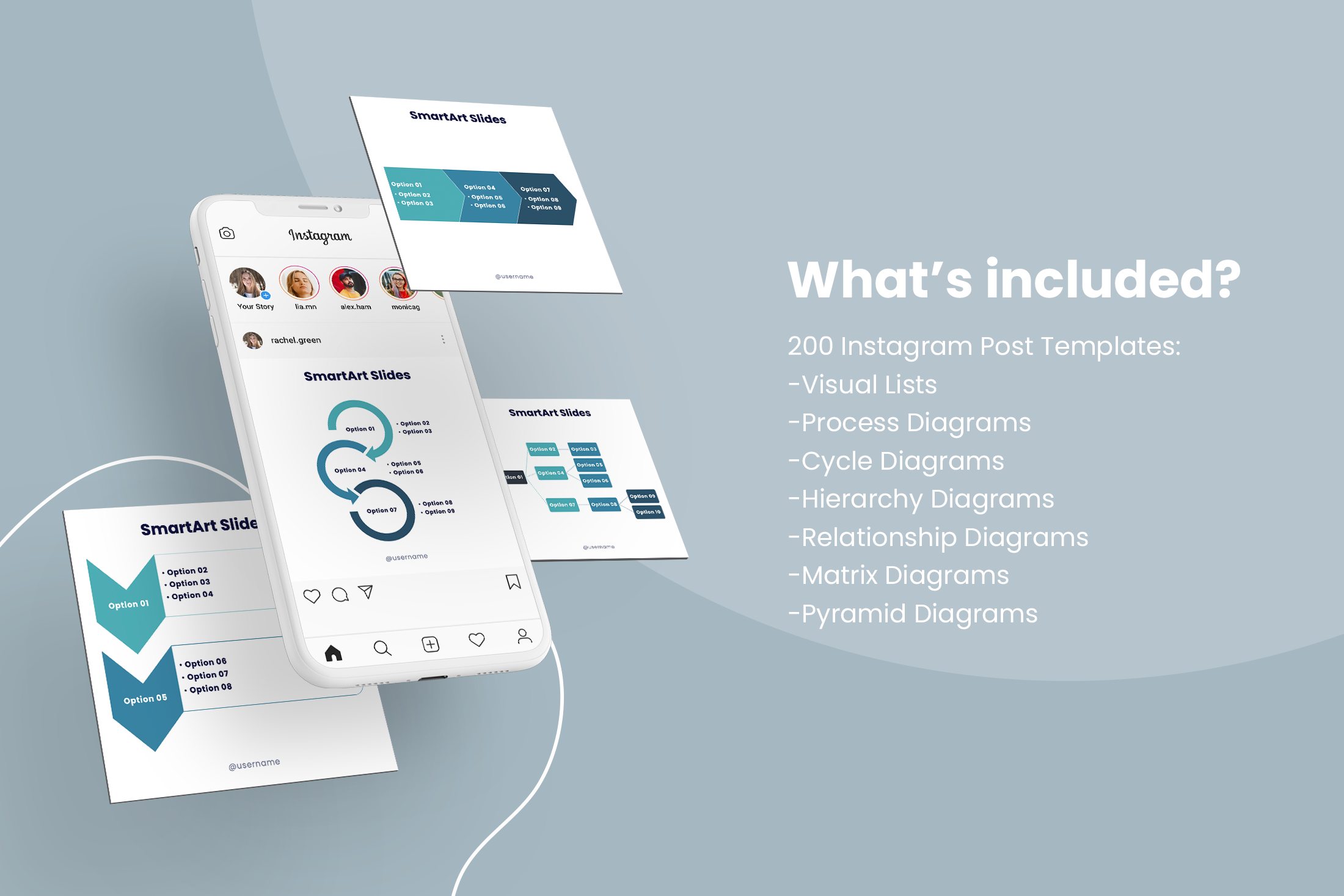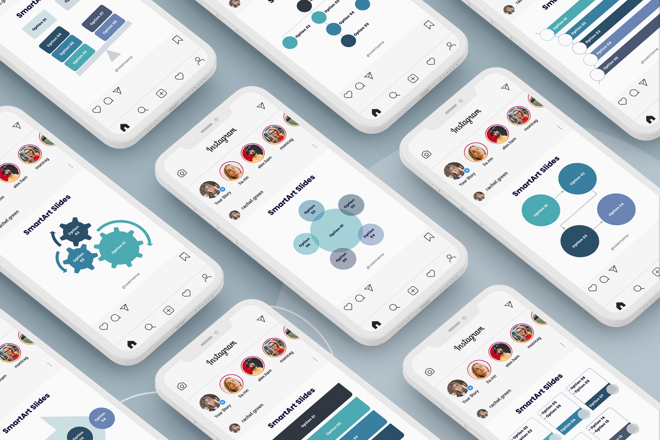 Our unique square Smart Art post are great for Instagram posts. You'll be able to create steps, cycles, diagrams, comparison slides and more. Not only will you able to find the perfect slide but you'll be able to easily add steps without having to rearrange the entire slide.