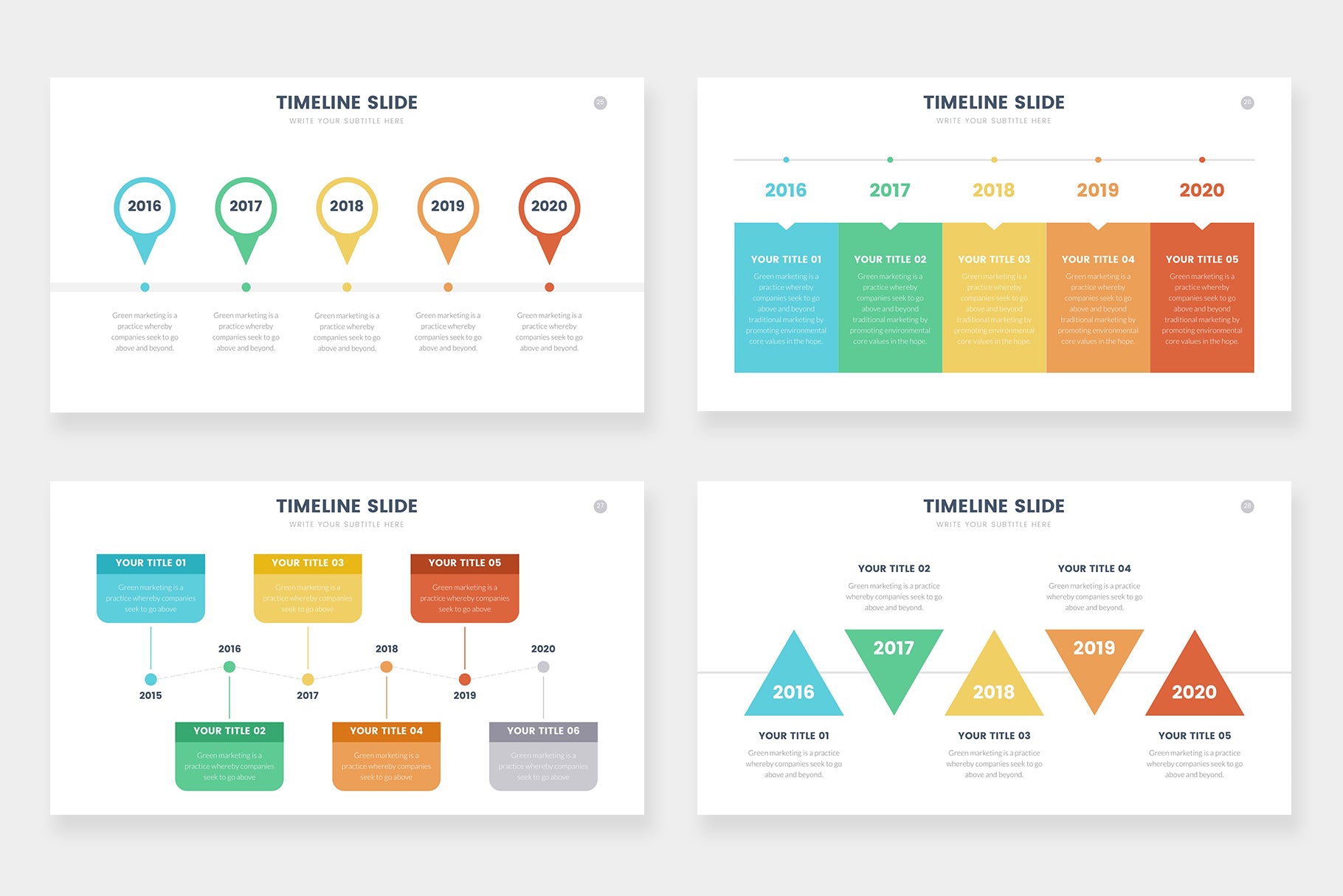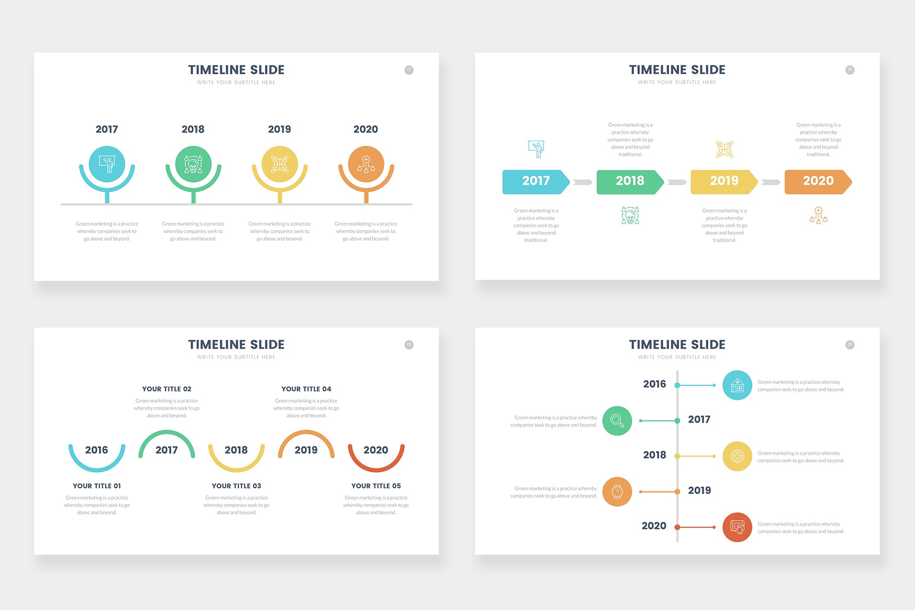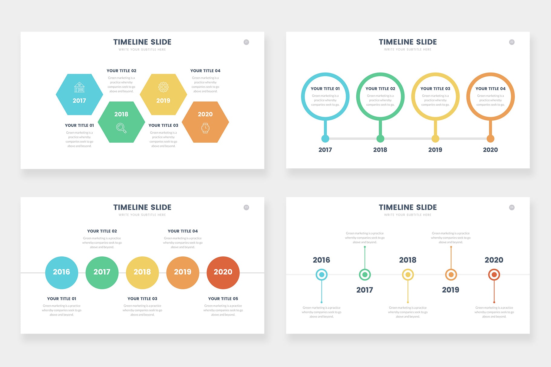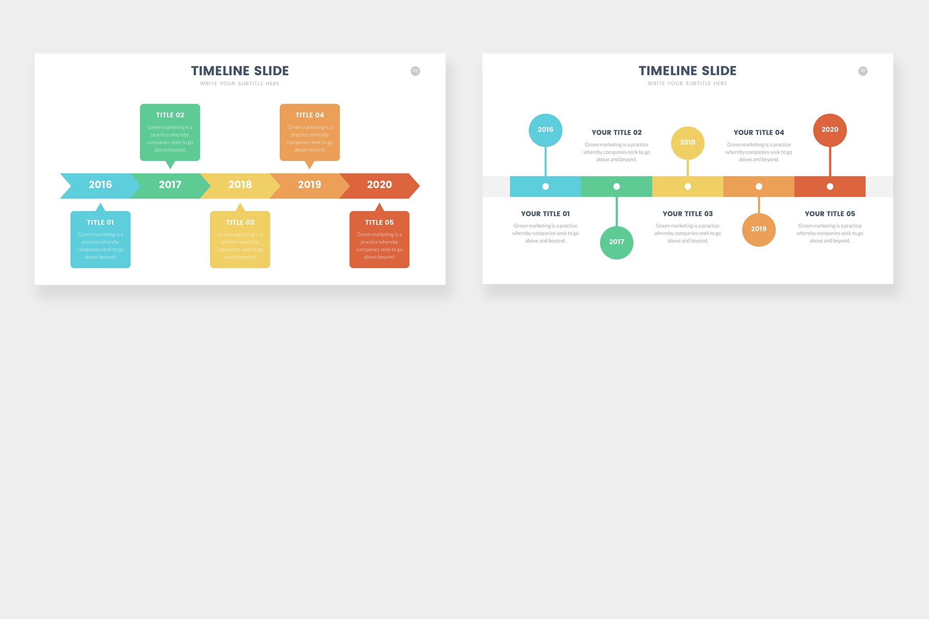 Timeline infographics compatible with Powerpoint, Keynote and Google Slides. step by steps