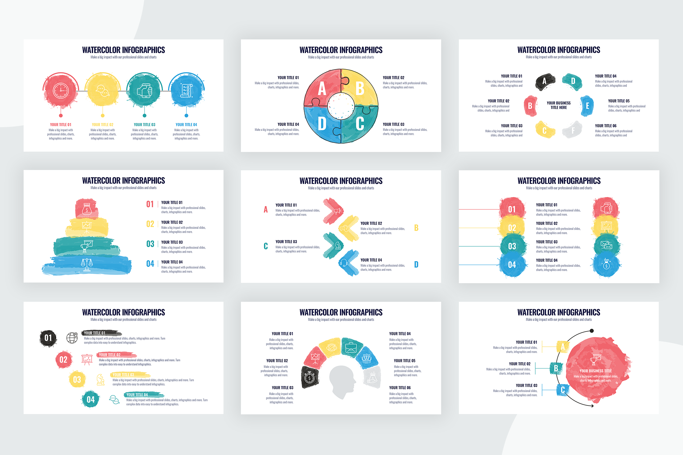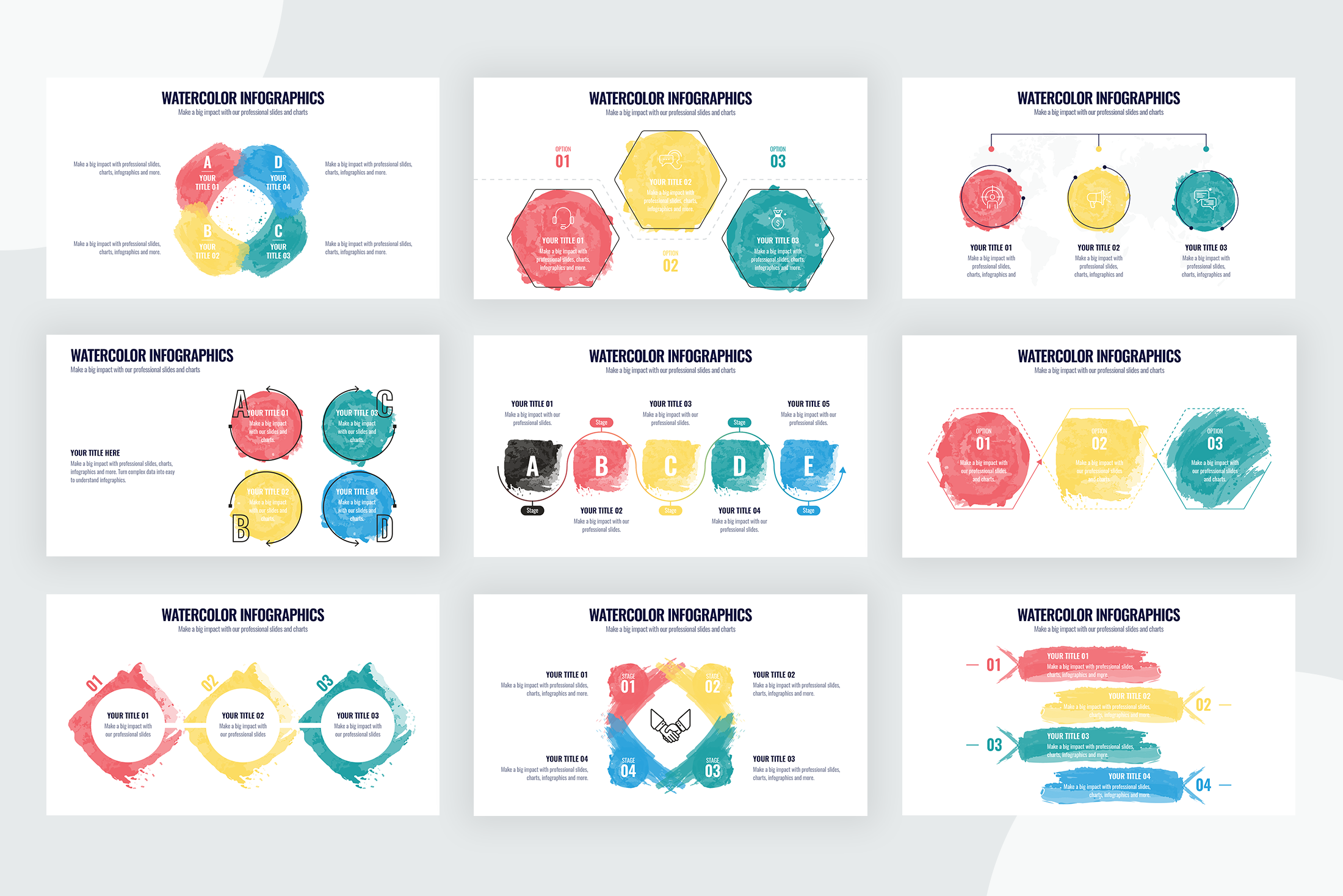 Watercolor Infographic Templates compatible with Powerpoint, Adobe Illustrator, Keynote, and Google Slides.
